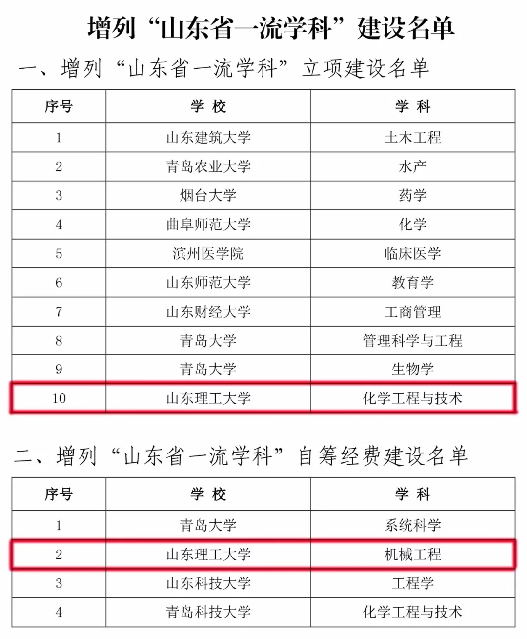 7月16日, 山东省教育厅下发《关于公布增列“山东省一流学科”建设名单的通知》(鲁教高字[2018]8号),我校申报的机械工程学科入选,进入山东省一流学科行列。