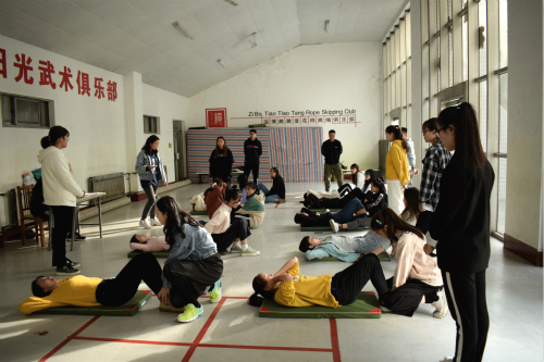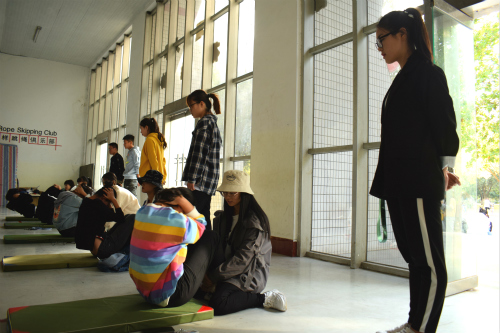 赛前,相关工作人员预先对场地进行布置,就比赛有关基础设施进行调整。比赛伊始,马凯向参赛选手说明比赛规则及注意事项,对仰卧起坐标准计数姿势进行说明并做演示。裁判就位后,马凯对裁判注意细则进行说明,要求裁判严守比赛规则,保证比赛公平公正。随后,各团队根据报名表次序依次进入比赛场地。此次比赛采用一分钟计时、两个团队分别监督的方式进行,规则要求一分钟时间内,完成次数多者为胜。每队比赛结束后,裁判依次向裁判长汇报参赛人员成绩,裁判长一并进行记录整理。随后,换由另外一队参加比赛。团队成绩按照十名参赛选手的成绩之和计算,团体奖励前八名,个人奖励前三名,比赛共持续50分钟。