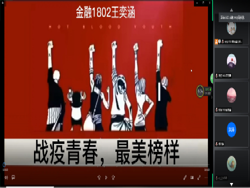 赛前,主持人代表全体参赛员工向各评委老师表示感谢。比赛伊始,十名参赛选手依次进行视频朗读展示,评委老师在每位展示结束后进行点评。其中金融1802班王艺涵朗读的《战役青春,最美榜样》赢得评委老师赞扬,表示该作品朗诵富有感染力,具有鼓舞性与激励性。配合视频效果,她将听众带入她所描述的世界,去感受抗疫英雄不怕牺牲,勇往直前的决心与信心。视频中一幕幕感人事件,一句句慷慨陈词直击人心,使人内心激荡。根据歌手周深作品—《听我说》,应化1702班邵昕蕊填词并演唱,赞颂逆行奋战于一线的医护工作人员为国出征,写下请战书,按上红手印,剪掉及腰长发,身穿厚重铠甲,舍小家为大家的奉献精神。音教1903班王晓萍带来《花的独白》,从花儿的视角进行朗读,视频中每一张照片都是亲自拍摄,展现出春天生机勃勃,万物复苏的景象。