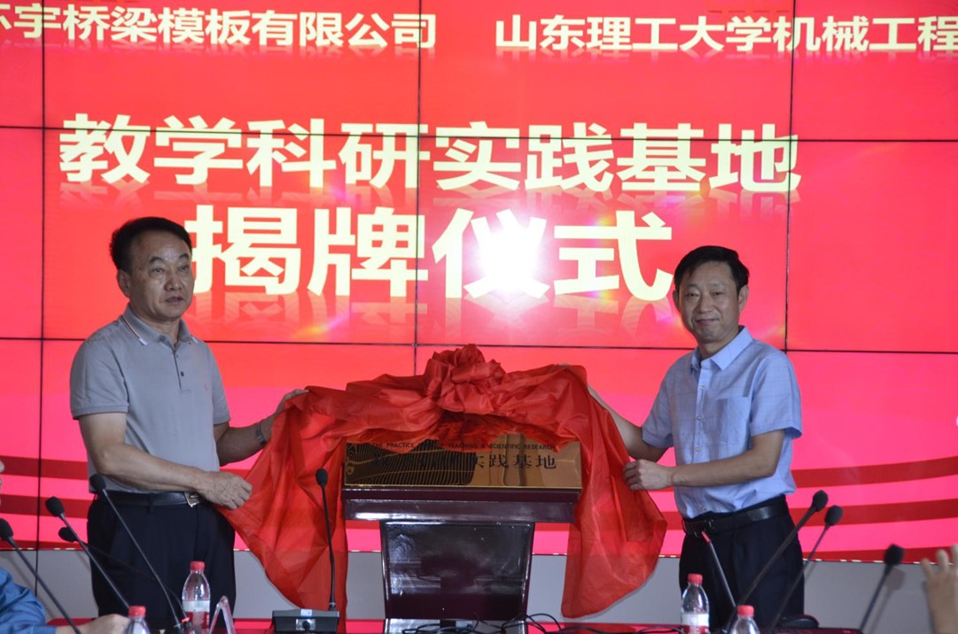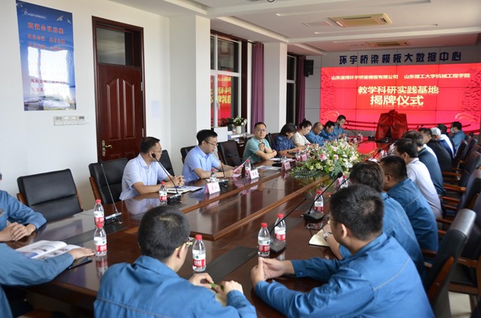 2021年8月18日上午,机械工程公司党委书记徐启达、副经理赵国勇等一行6人到山东淄博环宇桥梁模板有限公司进行合作洽谈,并举行技术培训班开班及教学科研实践基地揭牌仪式。桓台县党委常委、副县长徐庆堂、田庄镇党委书记刘春霞、桓台县科技局局长吴丹、田庄镇副镇长王帅、环宇桥梁模板公司董事长郭法传、总经理郭凯参加了培训班开班及教学科研实践基地揭牌仪式。