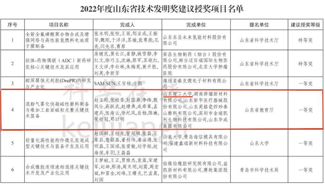 12月15日,山东省人民政府发布《山东省人民政府关于2022年度山东省科学技术奖励的决定》,其中,公司赵玉刚团队所研究的项目“混粉气雾化快凝磁性磨料制备与难加工曲面磁粒光整关键技术装备”荣获省技术发明奖一等奖。