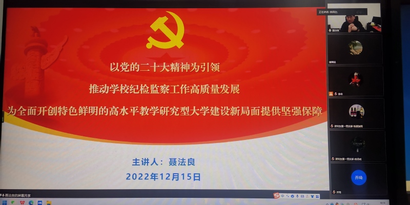 聂法良以《以党的二十大精神为引领,推动公司纪检监察工作高质量发展,为全面开创特色鲜明的高水平教学研究型大学建设新局面提供坚强保障》为题,用深入浅出的语言、生动详实的案例,从充分深刻认识全面学习党的二十大的重大意义、全面把握党的二十大的精神实质和精髓要义、全面落实党的二十大精神推动公司纪检监察工作高质量发展等三个方面,对党的二十大精神作了全面、系统、深入的宣讲,并与参会师生交流了自己的学习体会。