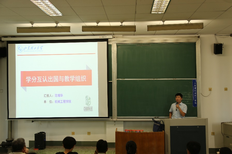 范增华从合作办学背景、学位互授、培养方案、奖学金设置、短期研学五个方面对学分互认与组织教学进行介绍。他通过照片展示往届员工在爱尔兰的学习生活,介绍中外合作办学的优势及对未来考研就业的影响。