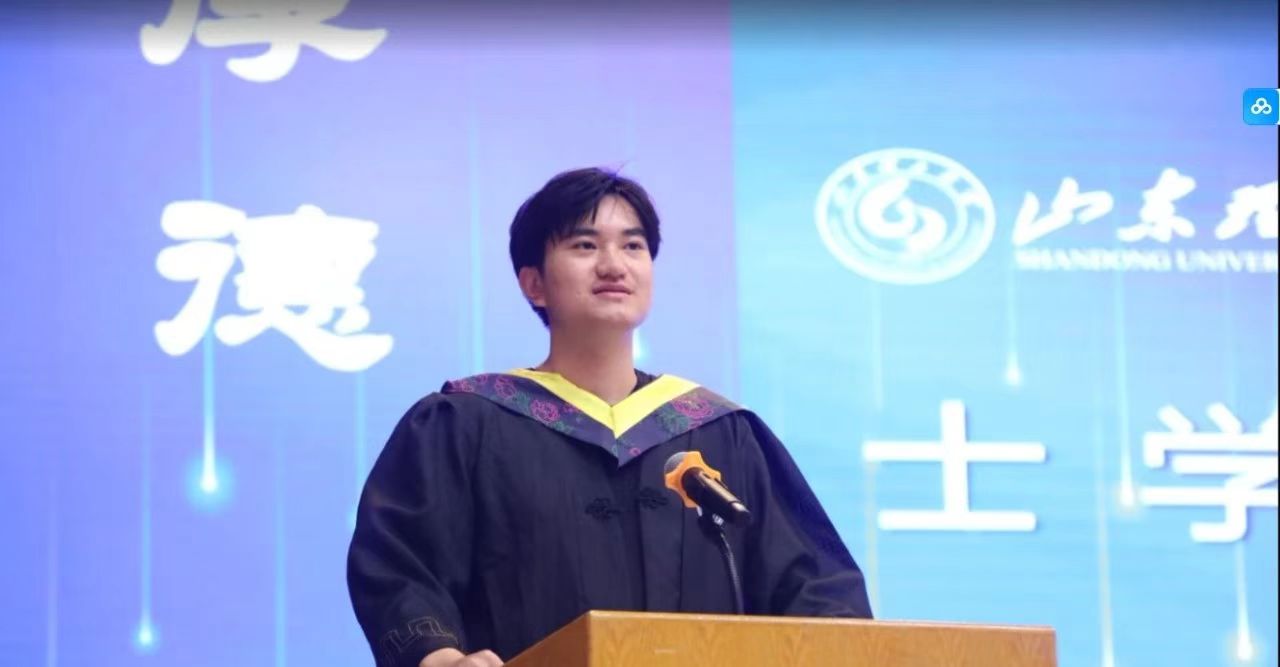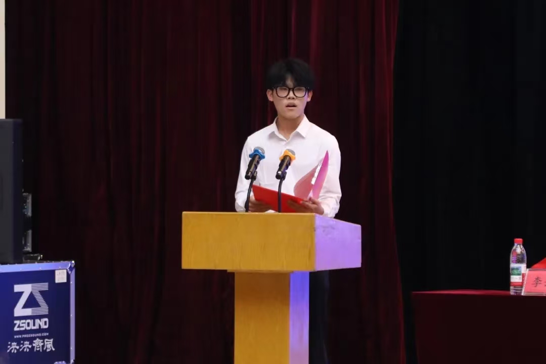 在校生代表机电2402徐文博发言。他回忆了与学长学姐的初遇,讲述了他们在学业、竞赛等方面树立的榜样力量,最后送上真挚祝福,愿毕业生们心怀梦想,奔赴山海,前程似锦。