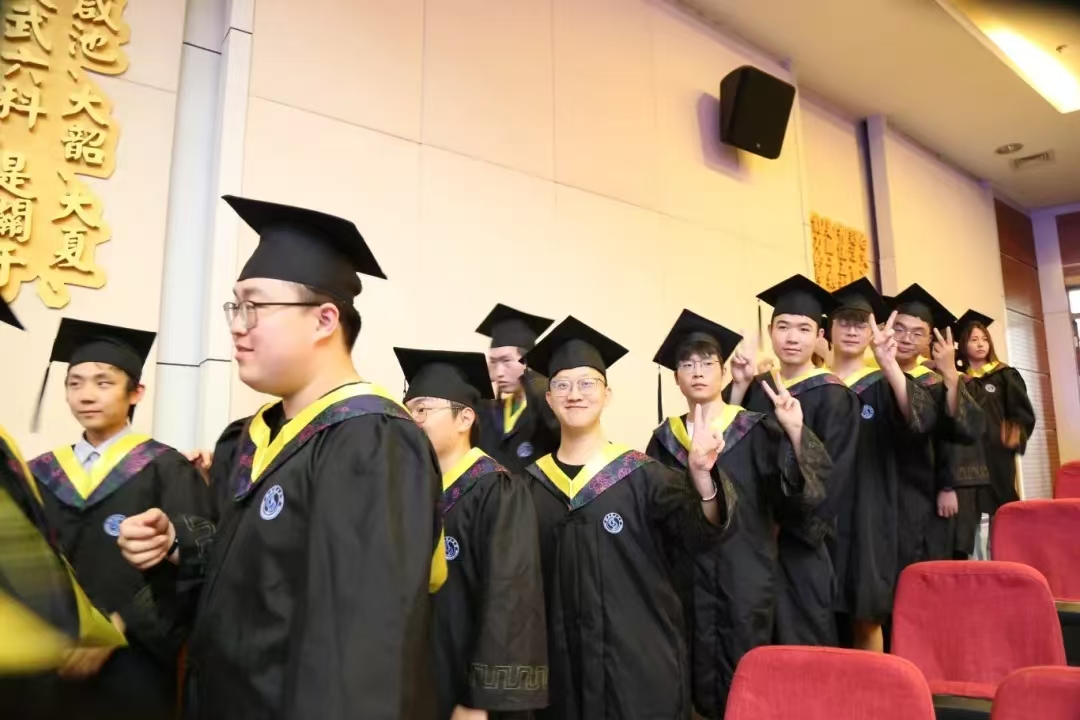 随着朗朗校歌的响起,学位授予仪式正式开始。10位教师为2025届毕业生正冠拨苏,授予学位证书并合影留念。