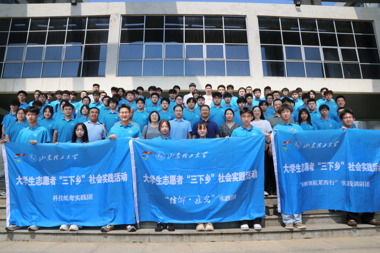 出征仪式结束后,领导老师和社会实践团队成员在机交楼前合影留念。