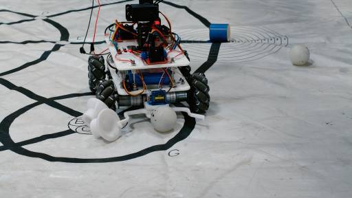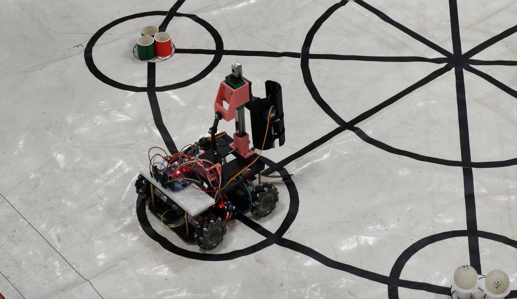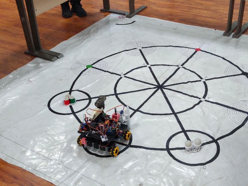 物资搬运区域选用表面光滑、易滑落的pvc物料块和高尔夫球,要求小车在动态行驶中完成“抓取—转运—投放”的全流程精准操作,对机械结构设计与动力控制精度提出严苛要求。